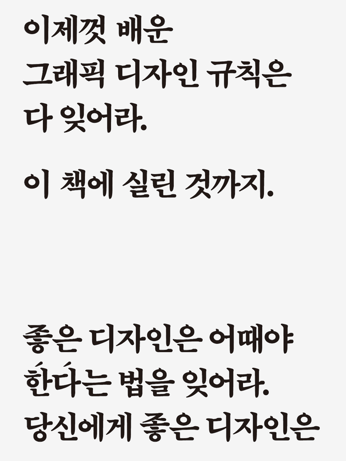 “이 책에 실린 것까지” 잊으라며 스스로를 얄궂게 부정하는 제목에서 드러나듯 책은 디자인 교재로만 쓸 수 있는 건 아니다. 한 분야에서 일가를 이룬 전문가가 30여 년에 걸쳐 제 손을 거친 작품을 주제에 맞춰 선별한 점에서 영국의 디자이너 겸 디자인 책 수집가 제이슨 고드프리(Jason Godfrey)가 그래픽 디자인 도서관(Bibliographic: 100 Classic Graphic Design Books)에서 규정하듯 전기적 작품집으로 여겨도 무방하다.