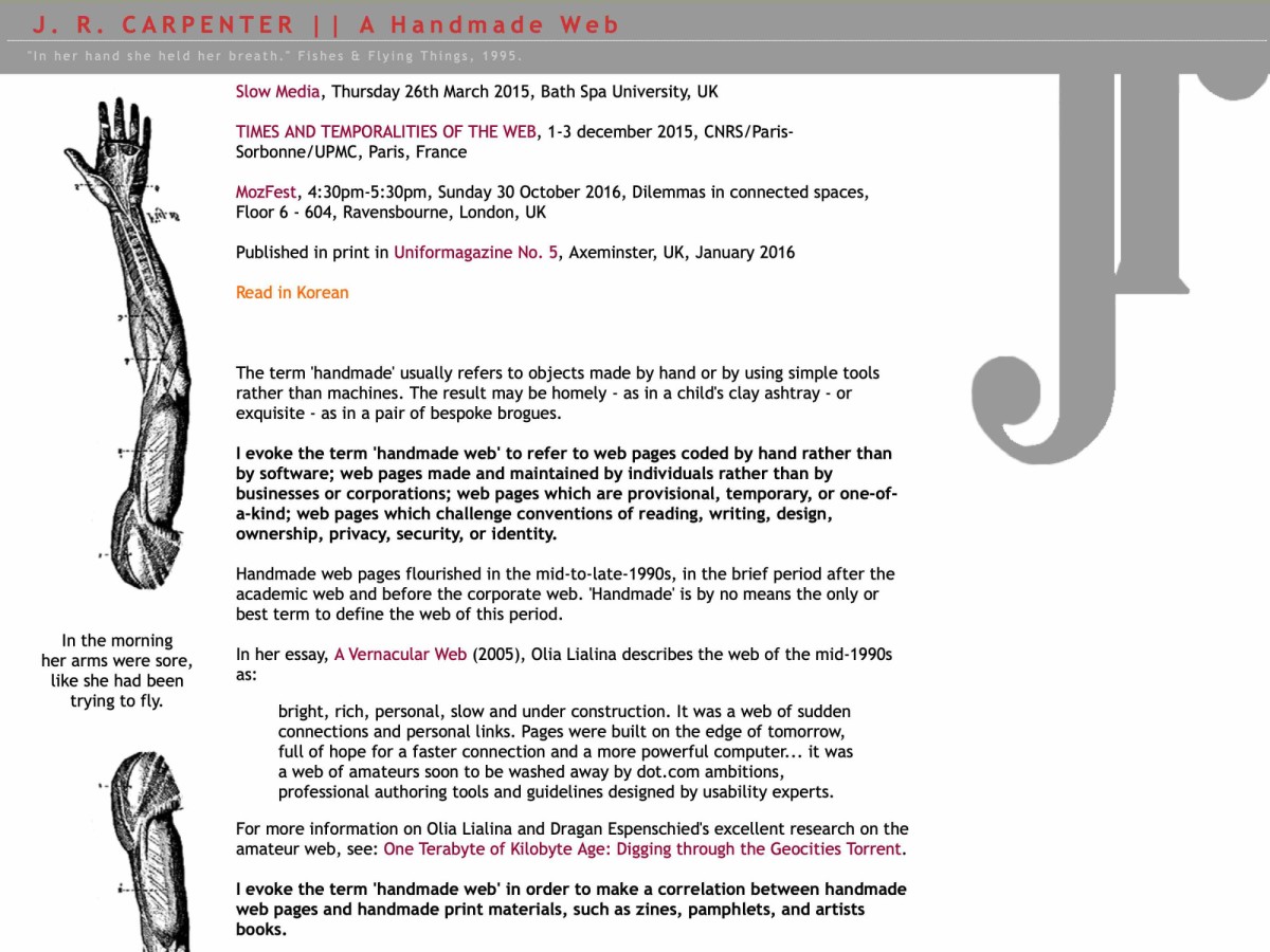 제가 민구홍 매뉴팩처링을 설립한 해이기도 한 2015년, 1세대 넷 아티스트 J.R. 카펜터(J.R. Carpenter)가 주창한 「핸드메이드 웹」(A Handmade Web)을 한국어로 번역했습니다. 뜬금없이 자신의 글을 번역하고 싶다는 어느 한국인의 메일에 그가 이런 답장을 보내왔습니다.