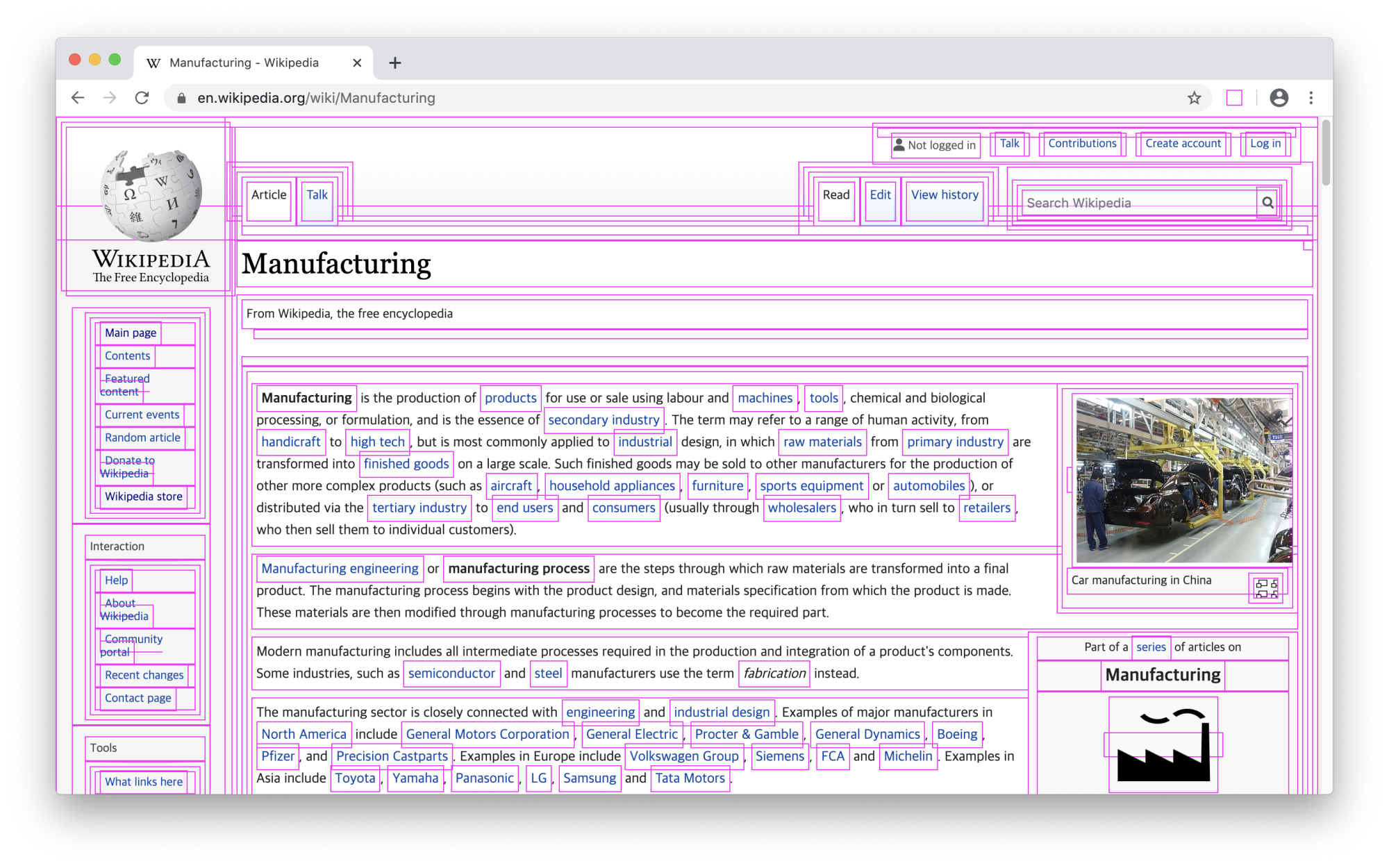 이것은 목록이다. 보이지 않는 상자로 이뤄진 항목이 중요도와 시각적 흐름에 따라 수직 또는 수평으로 배열돼 있다. 각 항목은 마트료시카처럼 다시 상자로 이뤄진 항목의 목록이고, 각 목록은 항목이자 또다시 상자로 이뤄진 목록이다. 이는 항목이 더는 나뉘지 않을 때까지, 즉 목록이 성립할 수 없을 때까지 반복된다.