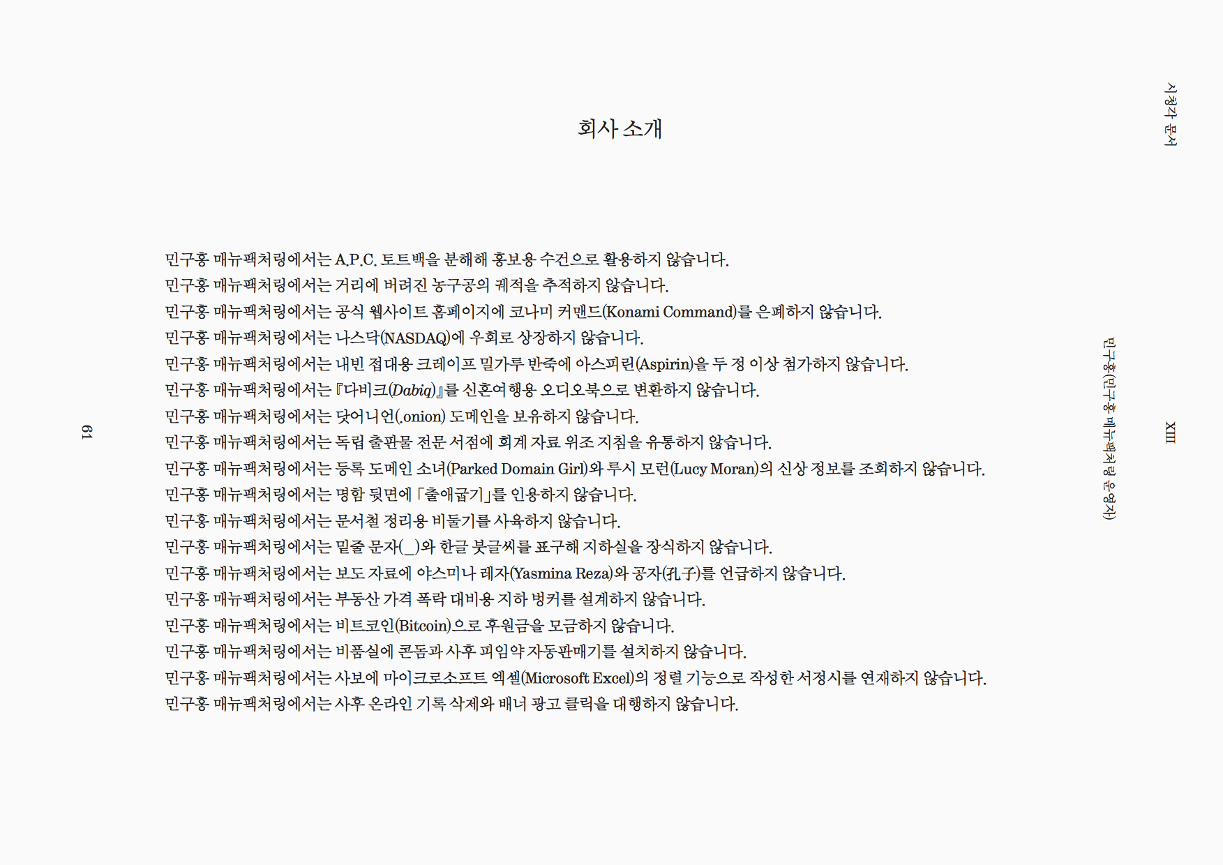 따라서 이것 또한 목록이다. 한 회사에서 수행하지 않는 일을 밝힌 문장으로 이뤄진 항목이 알파벳순과 가나다순에 따라 수직으로 따라 배열돼 있다. 자세히 들여다보면 항목은 다시 목록의 형태를 띤다. 목적어, 동사의 어간, 연결 어미로 이뤄진 항목이 또 다른 항목인 “민구홍 매뉴팩처링에서는”과 “않습니다.” 사이에 자리 잡는다.