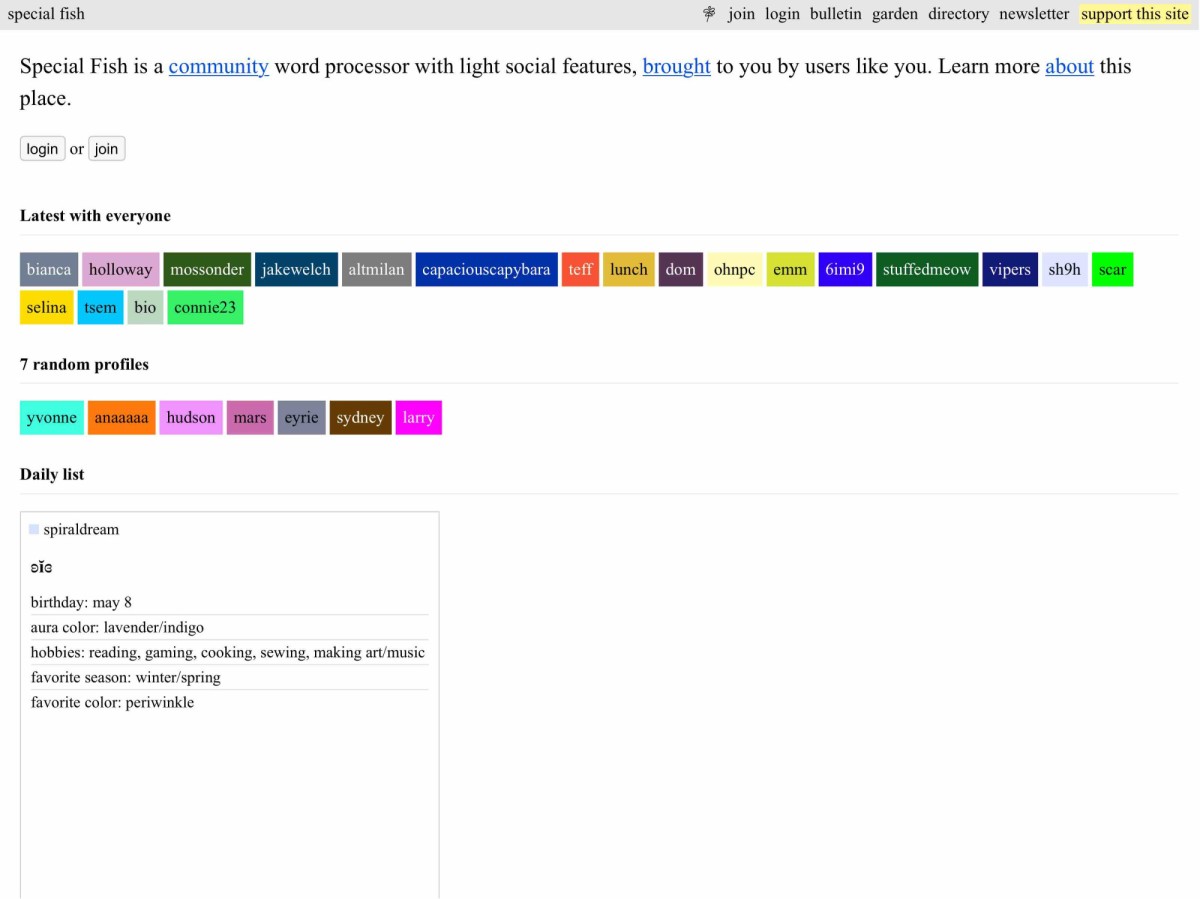 2020년 봄, 내가 정식으로 문을 연 스페셜 피시에 가입한 무렵 나를 포함해 아홉 마리에 불과하던 물고기는 이제 어림잡아 1,000마리가 훌쩍 넘는다. 요란한 홍보 없이 너그러움과 호기심에서 비롯한 입소문만으로 (어차피 웹상에서는 유명무실한 어휘지만) 전 세계에서 모여든 물고기는 각각 목록으로 만들어진 웅덩이에서 자신만의 방식으로 헤엄친다.