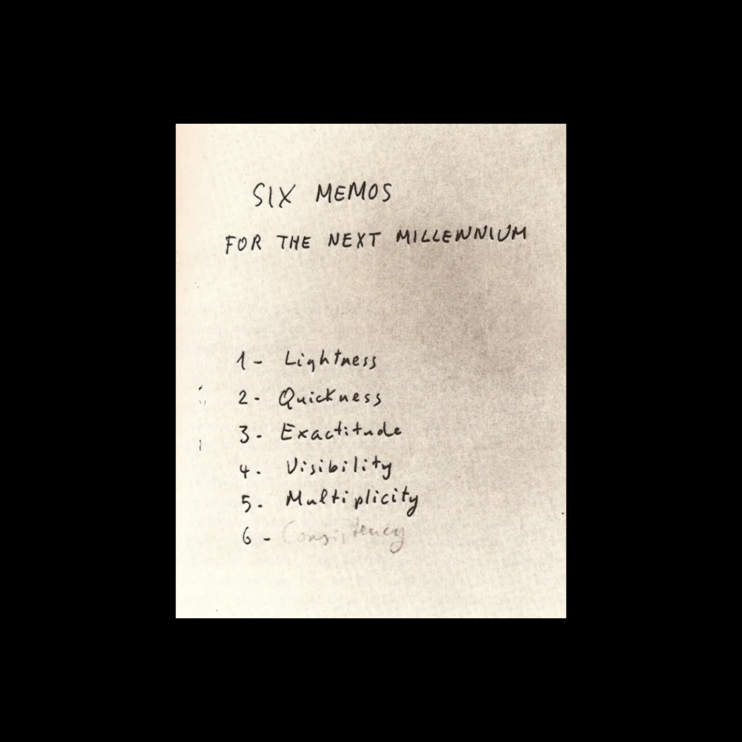 저는 제가 태어난 해인 1988년에 관해 조사하는 걸 좋아해요. 1988년에는 서울에서 제24회 하계 올림픽이 열리고, 최장 수중 해저 터널이 개통되고, 이탈로 칼비노(Italo Calvino)의 마지막 강연인 『다음 천년을 위한 여섯 가지 메모』(Six Memos for the Next Millennium)가 출간됐죠.