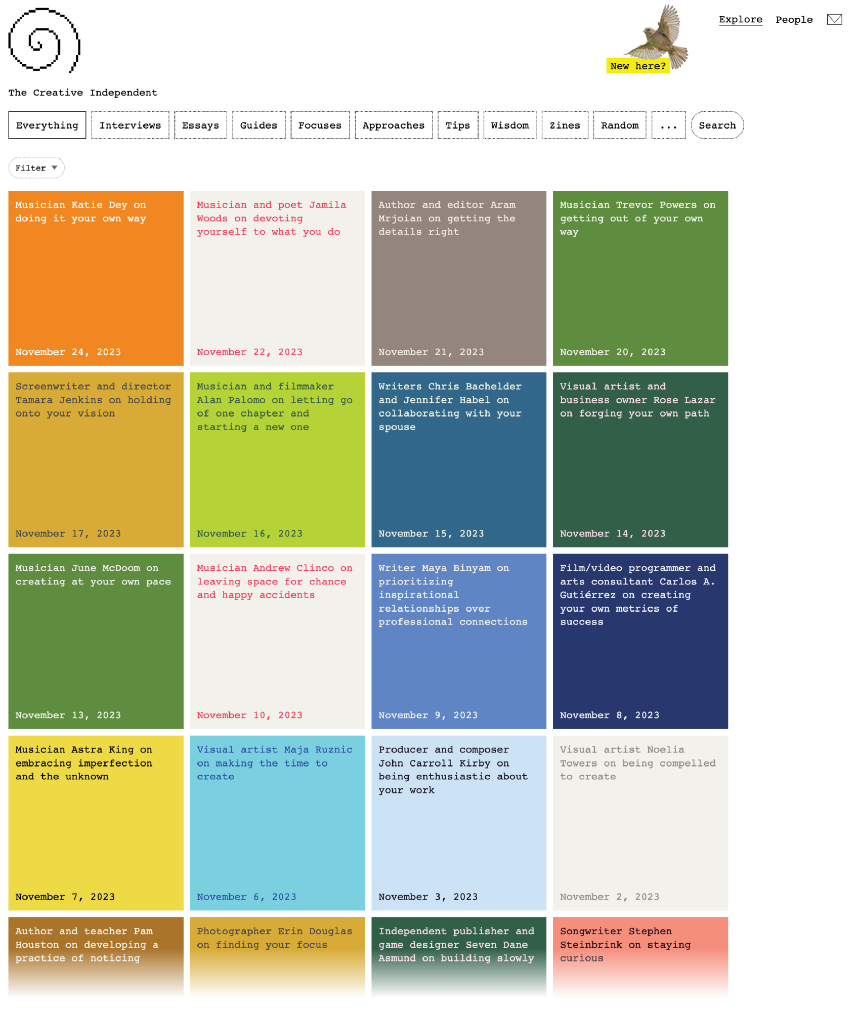 로럴 슐스트: TCI에서는 자유가 정말 많았어요. 놀라운 기회였죠. 예술가와의 대화를 평일에 한 편씩 소개하고 창작 과정에 초점을 맞추는 게 기본적인 콘셉트였어요. 모든 대화는 당장 열리는 행사와 연결되는 게 아니라 몇 년 뒤에도 유용할 수 있기에 ‘언제나 푸른’(evergreen) 콘텐츠로 불렀습니다. ‘크리에이티브 인디펜던트’는 신문 제목에서 따왔지만, 저희는 TCI를 끊임없이 성장하는 자료, 즉 ‘창작을 위한 위키백과’로 여겼죠. 조사도 많이 했어요. 앞서 언급한 줄리아 카메론의 『예술가의 길』도 이때 읽었죠. 특히 오디오북 버전에서는 아름다운 플루트 선율이 흘러나와요. TCI를 세상에 내놓은 뒤에는 특별한 친구도 만났습니다. 뛰어난 예술가이자 디자이너이자 개발자인 엘리엇 코스트(Elliott Cost)가 TCI에 합류했거든요. 제가 고용한 그 덕에 제가 TCI를 떠난 뒤에도 제 생각이 이어질 수 있었고요.