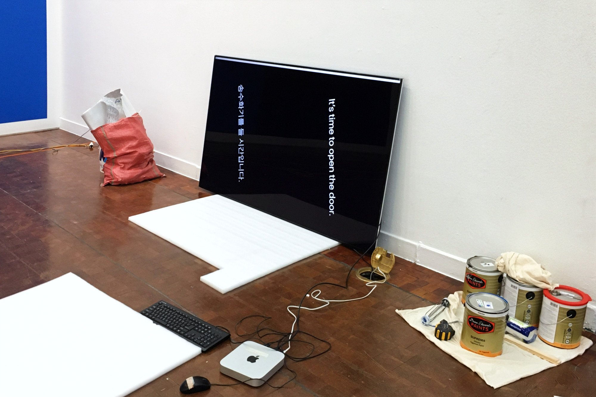 민구홍 매뉴팩처링에서는 용기를 얻었고, 그렇게 시계는 조금 더 넓고 조금 덜 흰 공간에서 제품 대신 작품 사이에 제품이 아닌 작품으로 진열됐다. 시계를 주사할 85인치 TV가 설치된 높이는 전시장 출입구를 알리는 초록색 표시판(코팅된 나무 바닥으로부터 약 3미터)과 동일했다. 전시 기간 시계 속 문장은 자리한 일부 변경되거나 추가됐고(“출입구를 확인할 시간입니다.” “정부에서 지정한 사회적 거리를 유지할 시간입니다.”), 그 흔적은 전시가 끝나고 시계가 제 자리로 돌아온 뒤에도 고스란히 데이터베이스에 남아 있다. 뒤이은 전시들이 모두 취소된 덕에 민구홍 매뉴팩처링에서는 예정보다 3개월 더 회사를 소개하는 행운을 누렸다. 다행이 큐레이터가 항의문에 해명할 자료를 준비하는 일은 일어나지 않았다. 소정 근로 시간 외에 전시장을 방문한 회사의 임직원 몇몇이 시계를 보는 순간 짐짓 놀랐다는 후문이 돌기도 했다.